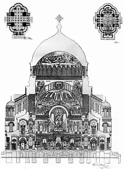 Makarov took control of the project and invited Vasily Kosyakov (1862–1921), already a renowned master of Neo-Byzantine architecture. The process of this choice remains undocumented, however, Kosyakov had worked for the Navy before as the architect of church of Our Lady the Merciful in Saint Petersburg. Kosyakov, still in his twenties, had perfected the optimal proportions of a single-dome, four-apse Byzantine design; his 1888–1891 drafts of a church in Astrakhan (itself based on Our Lady the Merciful) were reused all over the Empire.[19] Vasily's younger brother and partner Georgy Kosyakov (1872–1925) was a talented graphic artist; he worked on interiors and finishes while Vasily handled overall and structural design. Makarov personally instructed Kosyakov that the cathedral must accommodate 5,000 worshippers and follow the historical Byzantine canon.[18]