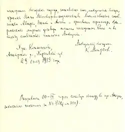 In 2006, a handwritten diary by Misirkov written during his stay in Russia in 1913 was discovered. It was declared authentic by Bulgarian and Macedonian experts and was published in 2008.[44] The content of the diary clearly shows that at the time, Misirkov identified himself as a Macedonian Bulgarian and had a clear pro-Bulgarian stance.[45][6] He also criticized Russia and France for their support of Serbia and Romania and their lack of efficient support for Bulgaria.[46] The manuscript includes 381 pages written in the Russian language. Misirkov wrote it in Kotovsk's nearby village of Klimentove, where he lived and worked at the time. It also contains articles and excerpts from the Russian press from that time. It has given rise to new public discussion over Misirkov's stances on Bulgarian and Macedonian ethnicity.[47] Per academic Alexis Heraclides, Misirkov's stance was not clear-cut and he sounded Macedonian at times too.[48]