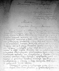 There was a debate about Misirkov's ethnicity in North Macedonia issued by Dr. Rastislav Terzioski, who brought to light memos from Russian archives which clearly stated his pro-Bulgarian positions.[62] The publication of his 1913 diary, which revealed his pro-Bulgarian views, sparked a major controversy in Skopje.[6] The Social Democratic Union of Macedonia even called for the dismissal of Zoran Todorovski, who was then director of the State Archives of Macedonia. Regarding Misirkov's signature as a "Macedonian Bulgarian", the Macedonian historians and linguists argue that it means a Macedonian person with a Bulgarian citizenship.[63] On the other hand, according to Dr. Vlado Popovski, Misirkov's usage of the term "Macedonian Bulgarian" was only a tactic as a consequence of the Balkan Wars and the Bucharest Agreement. Furthermore, per Popovski, he considered that since it is not allowed to be a separate political unit, is better for Macedonia to remain whole than to be divided among the Balkan states and in that sense, he gives preference to Bulgaria on the basis of historical ties and on cultural closeness.[64] The academic Blaže Ristovski has espoused similar view, that this were not genuine beliefs and sentiments of Misirkov but were dictated by the conditions of the time.[65] Also per Ristovski, based on the testimony of Misirkov’s son and grand-daughter, when Misirkov lived in Sofia, and particularly in Bessarabia, he had to assist the Bulgarians because they were more numerous compared to the Macedonians, who were few.[48] In 1914 and many times after that, Misirkov repeated his views about the Macedonian national existence.[66]