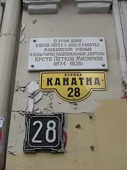 After being expelled by the Romanian authorities, Misirkov returned to Sofia at the end of 1918, where he spent one year as a head of the Historical Department of the National Museum of Ethnography. He proceeded to work as a teacher and director of the high schools in Karlovo and Koprivshtitsa.[17][25] During this period (but before 1923), IMRO marked Misirkov as harmful to its cause and supposedly considering his assassination, but reconsidered after he met with a representative of the organization.[29] In this period, Misirkov also advocated a Bulgarian identity for the Macedonians as a choice preferable to Serbian.[30] He also resumed his journalistic activity and published many articles on the Macedonian Question in the Bulgarian press and in some of them expressed Macedonian national ideas. In the article "The Path of Reconciliation" from January 1925 he wrote: "The Macedonian national feeling and national awareness are as old as the Bulgarian and the Serbian are." In another article called "Macedonian nationalism", Misirkov stressed that the: "Macedonian intelligentsia sought and found other means to fight with, namely an independent Macedonian scientific thought and Macedonian national consciousness."[7] Misirkov wrote in the article "School and socialism" from May 1925: "In 1897 I went to Petrograd University and for five years was among the Bulgarian studentship as Bulgarian and member of the Bulgarian Student Society."[20][31] Misirkov died in 1926 after a short illness and was buried in the graveyards in Sofia. The Ministry of Education issued a financial support of 5000 levs for his burial.[32]