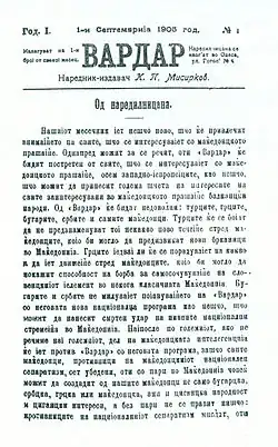 Misirkov was the author and editor of the first scientific magazine in Macedonian.[42] The magazine Vardar was published in 1905 in Odessa, Russian Empire. The magazine was published only once, because of the financial problems that Misirkov had been facing with at that time. He expressed views about the national distinctiveness of the Macedonians.[13] According to Blaže Ristovski, its orthography was almost the same as the orthography of standard Macedonian.[43] The magazine was meant to include several different scientific disciplines, mostly concerned with Macedonia.