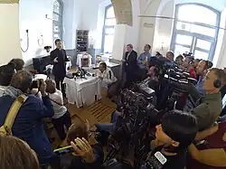 Charamsa timed his coming out in anticipation of the second session of the Bishop's Synod on the Family, scheduled to begin on 4 October 2015. Two days before it opened, he announced he was gay in an interview in Polish for a film then in production, Article Eighteen, a documentary about the campaign for same-sex marriage in Poland.[5][a] His announcement attracted considerable attention in the Polish media.[8][9][10]