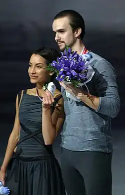 First alternates for the 2013 European Championships, Stolbova/Klimov were called up to replace Vera Bazarova / Yuri Larionov who withdrew due to Larionov's wrist injury.[5] After finishing sixth at Europeans in Zagreb, they won their first senior international title at the 2013 Bavarian Open. In April 2013, the pair said they wanted to move to Moscow to work with Nina Mozer, who agreed to take them in her group.[6][7][8] The move was opposed by Oleg Nilov, the head of the Saint Petersburg skating association, arguing against a concentration of skaters in Moscow,[9] but was authorized by the Russian skating federation.[10]