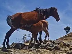 This population of horses owes its name to the biotope in which it has long evolved in the wild, Mount Kundudo.[2][3][4][5] Very little is known about their history, as there are no written sources.[3][6] Oral tradition, gathered from the oldest local inhabitants, has it that these horses have been known for over 200 years, and that the future emperor Haile Selassie I captured one of them with the help of his uncle, at the age of 10.[3][7] One oral hypothesis as to the origin of these horses is that their ancestors were military mounts left behind after the Ethiopian-Adal war and later Ottoman–Ethiopian War from 1528 to 1560.[3][6][8] It is possible that a small group of 10 to 15 horses survived for decades despite the past presence of lions and cheetahs.[7] However, there is no tangible evidence in favor of an origin theory.[9][10][11] The relatively close genetic distance between the Kundudo wild horses and the domesticated Abyssinian horses suggests, however, that the Kundudo may be a sub-population of Abyssinian horses that returned to the wild in the recent past,[12][13][14] perhaps during the military events of the 16th century.[13][14]