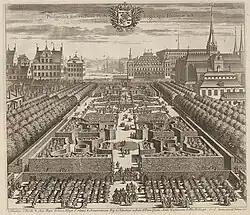 Though the royal kitchen garden is known to date back to the Middle Ages, it is first mentioned in historical records as konungens kålgård ("king's cabbage garden") in 1430. (See also Trädgårdsgatan.) The royal property in the area was considerably enlarged through an acquisition in 1454 and further expanded throughout the following century. This utilitarian garden was gradually transformed into an enclosed royal Baroque pleasure garden and accordingly referred to as "King's Garden"[7] throughout the 17th and 18th centuries. The garden was a symmetrical composition centred on a fountain and separated from the waterfront by the Makalös Palace ("incomparable").[8][9]