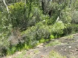 This kunzea grows in heath and forest, mainly in rocky places and in creek beds. It is found on the western slopes of the Great Dividing Range and is common in the Warrumbungle and Mount Kaputar national parks.[2][3]