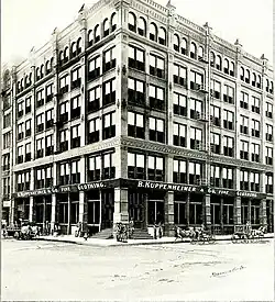 In 1852, Bernard Kuppenheimer, who immigrated to America in 1850, founded a retail clothing store in Terre Haute, Indiana.[1] In 1863, Julius Kohn, Martin Clayburgh, and Morris Einstein founded Kohn, Clayburgh & Einstein at 27 Lake Street in Chicago. Only two years later, in 1865, Kohn retired and Bernard Kuppenheimer,[2] who relocated to Chicago leaving the Terre Haute store under the supervision of his brother John,[1] and David Lindauer became members. Clayburgh, Einstein, Kuppenheimer, and Lindauer continued to operate the company without changing the name. They operated out of the Lake Street location until the Great Chicago Fire of 1871, when their building was burnt to the ground and they suffered losses totaling $200,000 (equivalent to $5,249,000 in 2024). After rebuilding, they resumed business and in July 1872, moved to the corner of Randolph Street and Wabash Avenue where they remained until the fall of 1876.[2]