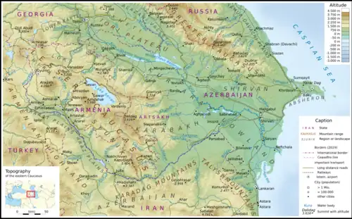 The Kura-Aras Lowland, Kura-Aras Depression or Kura-Aras Basin[1] (Azerbaijani: Kür-Araz ovalığı) is a vast depression in central-southern Azerbaijan defined by the valleys of the Kura River and Aras River. It is situated by the West shore of the Caspian Sea and is part of the Aral-Caspian Depression. It is delimited by the Greater Caucasus from the North, Lesser Caucasus from the West and the Talysh Mountains from the South.[2] The name is derived from the names of the two rivers in the area: the Kura and the Aras.[3]