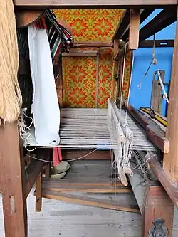 An important branch of household work was weaving and processing wool, flax, and hemp. Flax was harvested in mid-August, after which it was threshed, soaked, and dried. The fibers were then processed using a flax brake and beaten with a flax mallet on wooden beams or stools. After being combed with wire brushes mounted on boards, different quality fibers were obtained. These fibers were spun into yarn on spinning wheels, and from the yarn, fabrics were woven on home looms for making bags, sheets, covers, shirts, aprons, bedding, and clothing. Hemp fibers were used to make ropes or halters. Hemp thread was woven into coarse linen for bags or thick sheets. In the spring or autumn, sheep were sheared, and the fleece was separated into strands and carded with iron brushes.[41] Later, wool-carding machines became more common. Wool was spun on spinning wheels, and the threads were transferred to horizontal looms (weaving frames). Linen fabrics, linen-cotton blends, wool fabrics on linen or cotton bases, and woolen and yarn fabrics were produced. These were used to make bags, mattress covers, clothes, bedding, aprons, cloaks, towels, skirts, tablecloths, and more. More skilled weavers, and even some urban craftsmen, produced double-sided cloaks and double-warp carpets. The gradual decline of traditional folk attire coincided with the spread of factory-made fabrics from cities, although flax cultivation and weaving persisted until World War II.[41][42]
