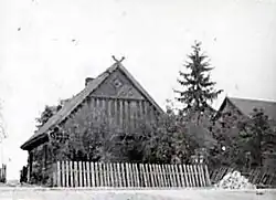 By the first quarter of the 20th century, all buildings were constructed only of wood using timber-frame construction, mainly used for residential buildings, or with a post-and-plank method. Houses were built according to one of three types characteristic of Puszcza Biała.[32] The first type was an asymmetrical wide-front building with an entrance on the side of the longer wall, built in a rectangular shape. Originally, these houses were single-room with a hall. Later, an additional room was added, which over time became a small chamber. Such houses were typical for small-scale farmers. The second type of house was a wide-front building with four rooms (a main room, a small chamber, a pantry, and a hall). This type developed from the first form under the influence of Kurpie settlement from Puszcza Zielona. In the interwar period, a third type of wide-front cottage appeared, which was constructed in the style of old serf houses. In this two-tract house, divided lengthwise by a hall into two parts on either side of the symmetry axis, two rooms were built. The entrance was from the road through an ornate porch to the hall and into the subsequent rooms, while the yard was accessed through the hall from the other side. After World War I, houses began to be built with cement blocks, which differed from traditional Kurpie construction. Life was centered in the most important room, the main room, which served residential, economic, social, and cultural functions, supported by its division into areas corresponding to these functions.[32][33]