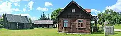 The relocation of the Kurpie to Puszcza Biała necessitated a shift to more planned settlement patterns. The villages in the forest were organized as przysiółeks and linear settlements. In the 19th century, most of them were transformed into Zeilendorfs due to land reform and emancipation.[30] The farmsteads were laid out in a rectangular plan, within which the house and outbuildings were constructed. The house always faced the road with its gable wall, close to which it was placed. At the back of the farmstead was a barn, with its front wall facing the house, sometimes featuring a so-called wystawka (a space for carts, sledges, and agricultural tools). On one side of the farmstead were the granary, woodshed, and pigsty, while on the other side were the cowshed and stable. Feed for horses and cattle was stored in the attics of the cowshed and stable. Chickens, geese, and ducks were raised. Grain and valuable agricultural tools were stored in the granary, straw stacks, and sacks. In the yard, a well was dug and a dugout, known as a śklep or parsek, was built. Next to it was a vegetable garden (sometimes also an orchard). The area beyond the yard, enclosed by a wooden fence, was called the gardens, where cows, horses, and geese were grazed. Sometimes this area was used for drying flax and linen. Hay barracks from the meadows were set up behind the barn.[30][31]