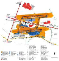 Kursdorf is located within Leipzig/Halle Airport, in the town of Schkeuditz between Leipzig and Halle (Saale). To the south is runway 08R/26L, and to the north is the Erfurt–Leipzig/Halle high-speed railway (near the Leipzig/Halle Airport station), Autobahn 14, and runway 08L/26R.[4] Being surrounded by runways and taxiways, the only way out of the village is to the east, under an aircraft bridge.[5]
