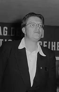 In 1946, Barthel returned to Germany and joined the Socialist Unity Party. From 1946 to 1948 he worked as an editor at the party publishing house Dietz in East Berlin and from 1949 he switched exclusively to literary activity. Barthel soon became an exemplary party poet, composing hymns dedicated to the construction of socialism. Barthel gained fame as the author of a cantata in honor of Joseph Stalin.[3]