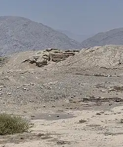 The site of Kush has been excavated by a number of teams since its discovery during a survey carried out by Beatrice de Cardi in 1977. It was the largest archaeological tell in the Emirates, measuring some 120m x 100m and rising some 6.5 metres from the surrounding plain.[2] It has been divided into two archaeological periods: period I consists of mud-brick construction dated to the 5th and 6th centuries that was thought to be military in purpose (with extensive finds of arrowheads), surrounded by a site of approximately one hectare comprising pottery sherds, post-holes, fire-pits, hearths and drains. Period II is built around a 14 x 7 metre rectangular tower made of mud brick, with 2 meter-thick walls pointing again to a defensive structure or fortification. The tower was abandoned in the late 8th century.[4]