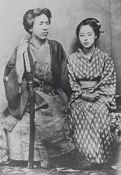 Kendō and Shūzō won prestigious appointments in the capital, and in 1873, through her connections with Fukuzawa Yukichi and other Western scholars, she attended the birth of the child of Emperor Meiji's concubine Hamuro Mitsuko; the child was stillborn and Mitsuko died four days later. Ine received the considerable sum of 100 yen for her effort.[20] Shūzō and Takako moved to Osaka in 1876, where Shūzō worked for the Osaka Hospital. In 1877 he became sick and died there.[21] Takako became pregnant from an acquaintance and gave birth to a boy in 1879, whom Ine adopted as her heir and named Shūzō. Takako married the doctor Yamawaki Taisuke, with whom she had a further three children before his death in 1886.[22]