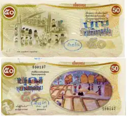 Kut Chum is known for its organic movement and organic foods, chiefly the organic farming of rice.[3] Kut Chum is also known for issuing its own local scrip called Bia Kut Chum. Bia, Thai for 'cowry shell', was once a unit of currency equal to 1⁄6400 of a Thai baht, and bia is used in metaphorical expressions, so the usage ran afoul of currency laws. To side-step implications that they intended a substitute local currency, they changed to Boon Kut Chum, which are barter coupons with a fixed value in baht, that may be exchanged for goods and services in the community.[4]