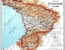 The Kutaisi or Kutais Governorate[a] was a province (guberniya) of the Caucasus Viceroyalty of the Russian Empire. It roughly corresponded to most of western Georgia throughout most of its existence, and most of the Artvin Province (except the Hopa and Yusufeli districts) of Turkey between 1878 and 1903. Created out of part of the former Georgia-Imeretia Governorate in 1846, the governorate also included Akhaltsikhe uezd before its cession to the Tiflis Governorate in 1867. The Kutaisi Governorate bordered the Sukhumi Okrug to the northwest, the Kuban Oblast to the north, the Terek Oblast to the northeast, the Tiflis Governorate to the southeast, the Batum Oblast to the southwest, and the Black Sea to the west. The governorate was eponymously named for its administrative center, Kutais (present-day Kutaisi).[1]