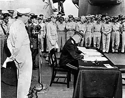 Derevyanko (at the time Chief of Staff of the 35th Army) was the representative of the Soviet Union at the ceremonial signing of the written agreement that established the armistice ending the Pacific War and with it World War II.[1] The Soviet delegation joined other Allied representatives on the battleship USS Missouri which was anchored in Tokyo Bay.[2] Together, the waiting Allies silently acknowledged the representatives of the Japanese Emperor and the representative of the Imperial Japanese Army, who were the last to arrive. The proceedings began when General MacArthur stepped before a single microphone. The 23-minute surrender ceremony was broadcast worldwide.[3] Derevyanko signed the Japanese Instrument of Surrender at precisely 9:17 a.m. in Tokyo Bay on September 2, 1945.[4] He served as Soviet representative at MacArthur's headquarters during the US occupation of Japan.