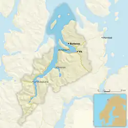 The landscape of today was largely formed during the last ice age. When the ice retreated, the terrain rose by 50 metres (164 ft). It is in this belt of old seabed that today's best farm land is located. There are four county roads connecting the municipality: two to the north and one each to the east and south. The highest point in the municipality is the 1,117.38-metre (3,665.9 ft) tall mountain Tverrelvtindan.[1] The 412-metre (1,352 ft) tall mountain Nupen is located in the northern part of the municipality on the border with Harstad.