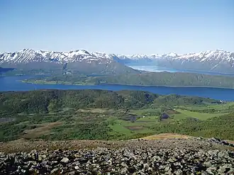 View of the Kvæfjorden, Kveøya, and Gullesfjorden from the mountain Raudmoldheia