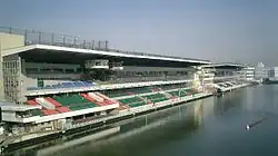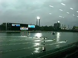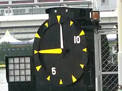 Kyōtei employs the flying start system of beginning races. Once competitors receive the signal to pit-out of the docks, they will maneuver their boats in an effort to secure a starting position while a large clock situated at the start/finish line begins a one-minute countdown. Starting positions are usually established with 30 seconds before the clock reaches zero, and with about 12 seconds remaining the boats begin to race up towards the start line at full speed.[4] Boats must cross the start line within one second after the clock reaches zero. Unlike typical powerboat racing, where if a boat crosses the line too early, there is a time penalty added to the offending boat, in Kyōtei, crossing too early - called a false start (フライングスタート, furaingu sutāto; "Flying Start") or crossing too late - called a "Late Start" (出遅れ, deokure), is an automatic scratch and bets on that boat are refunded, with the boat officially excluded from the race.[3] The Japanese term for this exclusion is "return absence" (返還欠場, henkan ketsujō). In a sense, the flying start system can be compared to the mobile start used in harness racing.