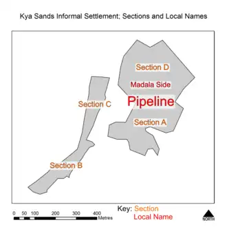 Kya Sands is made up of a number of sections. The settlement is broken down firstly into Sections A to D. These are defined by government and are used in counting and numbering houses and toilets in the settlement.[6]