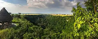 The landscape is gentle rolling savanna grassland, but is deeply cut by the 16 km Kyambura Gorge, which supports a thick riverine forest and the Kyambura River.[2]: 2