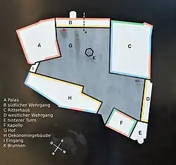 The castle forms an irregular quadrangle with a single courtyard atop a steep hill above the Töss valley. South of the castle, between the medieval neck ditches, is the French formal garden which was designed in 1700 by Caspar Schwarzenbach. The entrance to the castle is through the outer gate located on the north-east corner. The gate house was rebuilt in 1579-80 and decorated with coats of arms by Christoph and Josias Murer. A zwinger, or narrow, defensive passage, leads from the outer gate to the inner gate. A walkway goes over the zwinger and connects the palas, or great hall, with the Willenturm (Willen tower) on the north corner of the castle. The inner gate is protected by the bergfried, which was built in 1424 with the addition of a roof in 1444.[8]
