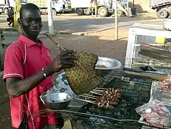 Kyinkyinga (pronounced chin-chin-gá) or cincinga (Hausa orthography), is a grilled meat skewer or kebab that is common and popular in West Africa and is related to the Suya kebab.[1][2] Kyinkyinga is a Ghanaian Hausa dish popularised by traders in the Zango areas of town and cities, and has since becoming popular among other Ghanaians. It is hence very similar to or synonymous with the suya kebab in Nigeria and Niger, also known as suya, tsinga, cinga, cicinga, cincinga, tsire agashi, cacanga or tankora in the Hausa language.[3][4][5]