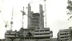 The complex was constructed using an uncommon method for Kyiv at the time. Initially, six reinforced concrete towers were built, four on the corners housing stairwells, and two central ones containing elevators. The structural spans between floors were created using 20-meter-long steel beams.[2]
