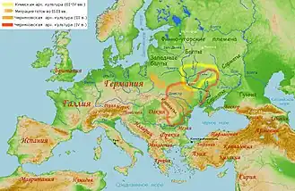 The Kyiv culture (Ukrainian: Київська культура, romanizedKyjivsjka kuljtura) or Kiev culture (Russian: Киевская культура, romanizedKievskaja kul'tura) is an archaeological culture dating from about the 3rd to 5th centuries, named after Kyiv, the capital of Ukraine. It is widely considered to be the first identifiable Slavic archaeological culture.[1] It was located in the "middle and upper Dnieper basin, akin to it sites of the type Zaozer´e in the upper Dnieper and the upper Dvina basins, and finally the groups of sites of the type Cherepyn–Teremtsy in the upper Dniester basin and of the type Ostrov in the Pripyat basin, in Ukraine and Belarus.[1] It was contemporaneous to (and located mostly just to the north of) the Chernyakhov culture.