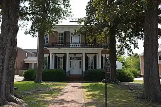 The original Kyle House, home to merchant James Kyle, burned in a city fire in 1831.[2] Rumor had it that the great fire began in the Kyle House's kitchen.[3] It was then rebuilt in about 1855 as a two-story, five-bay, brick town house with Greek Revival and Italianate style design elements. It features a three-bay wide one-story porch with a flat roof supported by four fluted Doric order columns.[4]