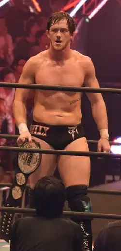Through ROH's relationship with NJPW, reDRagon made an appearance for the Japanese promotion on August 10, unsuccessfully challenging Time Splitters (Alex Shelley and Kushida) for the IWGP Junior Heavyweight Tag Team Championship.[97] reDRagon returned to NJPW on October 25 to take part in the 2014 Super Jr. Tag Tournament.[98] On November 3, reDRagon defeated The Young Bucks in the finals to win the tournament.[99] Five days later at Power Struggle, reDRagon defeated Time Splitters in a rematch to become the new IWGP Junior Heavyweight Tag Team Champions.[100] They made their first successful title defense on January 4, 2015, at Wrestle Kingdom 9 in Tokyo Dome, in a four-way match against Forever Hooligans, Time Splitters and The Young Bucks.[101] On February 11 at The New Beginning in Osaka, reDRagon lost the title to The Young Bucks in a three-way match, also involving Time Splitters.[102][103] reDRagon returned to NJPW on May 3 at Wrestling Dontaku 2015, where they unsuccessfully challenged for the IWGP Junior Heavyweight Tag Team Championship in a three-way match with Roppongi Vice (Beretta and Rocky Romero) and The Young Bucks.[104] Later that month, O'Reilly entered the 2015 Best of the Super Juniors.[105] Finishing with a record of six wins and one loss, he won his block and advanced to the finals of the tournament.[106] On June 7, O'Reilly was defeated in the finals of the tournament by Kushida.[107] Following the tournament, reDRagon received a rematch for the IWGP Junior Heavyweight Tag Team Championship in a three-way match, also involving Roppongi Vice, but were again defeated by The Young Bucks on July 5 at Dominion 7.5 in Osaka-jo Hall.[108] On August 16, reDRagon defeated The Young Bucks to win the IWGP Junior Heavyweight Tag Team Championship for the second time.[109] They lost the title back to The Young Bucks in a four-way match that also included Roppongi Vice and Matt Sydal and Ricochet on January 4, 2016, at Wrestle Kingdom 10 in Tokyo Dome.[110] On October 10 at King of Pro-Wrestling, O'Reilly received his first singles title shot in NJPW, when he unsuccessfully challenged Katsuyori Shibata for the NEVER Openweight Championship.[111] At Wrestle Kingdom 11, O'Reilly lost the ROH World Championship to Adam Cole.
