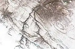 Northern slopes of the Karatau Range in the winter with the gorges of rivers Shabakty and Kyrshabakty and their confluence at the top.