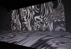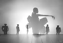 Two recordings of "flexile panoptiosis" are projected onto the façade of the Kunsthalle. The first recording shows the shadows of performers through a lace curtain. The second recording provides an overhead view of the same performance, which appears horizontally and parallel to the first recording. The performance, which takes place in the interior of the building, starts with the appearance of a queen, who is wearing items of fashion that visually symbolize her authority, including a ruffed collar and an elaborate gown, moving across the stage trailed by a procession of followers. All the performers wear the architectural elements of form, structure, material, plan and section as fashion items. At the beginning of the performance, the performers' fashionable accoutrements visually project power to the audience. As the performance proceeds, the performers progressively deconstruct the elements of power. At the end of the performance, the audience is invited to interact with these elements of power, inhabiting the same stage space as the performers, wearing and playing with these fashionable items as toys while appearing as shadows behind the curtain.