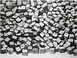 A similarly photorealistic painting is his naked self-portrait, in which he stands looking at the viewer, wearing only flip-flops and sunglasses. It is regarded as an outstanding political statement on the situation of the artist in the repressive Hungarian regime (see Self-portrait with self-timer, 1970, Uffizi Gallery, Florence.[53][54][55] The wish for change inspired many of his works (see Monument of the Revolutions, 1971, Museum Folkwang, Essen[56] and Barricade 1970 / oil on canvas / 150 × 200 cm).[57] He continued to base his photorealistic paintings on photographic documents,[58] often in brown-grey colours, brilliantly painting the change of sharpness in the depth of field from the original photo (Silence, Homage to Joseph Beuys, 1972 Ludwig Museum, Budapest[59]).
