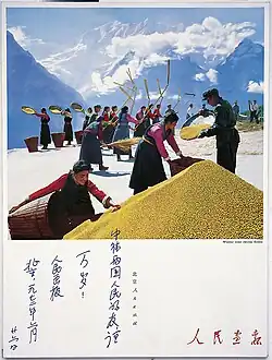 Another work was produced from an idealised Chinese photo, depicting farmers in the mountains being helped by Chinese soldiers. Lakner enlarged it to create a human-size photorealistic painting. The hand-written greeting of the newspaper editor who sent the photo to him, is also painted on the canvas.[80][81]