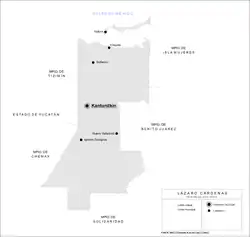 Lázaro Cárdenas (Spanish: [ˈlasaɾo ˈkaɾðenas] ⓘ) is one of the eleven municipalities that make up the Mexican state of Quintana Roo. Its municipal seat is the town of Kantunilkín, which was founded on 10 October 1859.[1] Its borders are, to the west, the municipalities of Tizimín and Chemax in the state of Yucatán, to the east the municipalities of Isla Mujeres and Benito Juárez, and to the south Solidaridad.