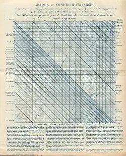 With Philbert Maurice d'Ocagne Lalanne is considered the inventor of the nomogram. The intention was to replace the slide rule.[8] In a paper of 1846 Lalanne contributed to the subject the ideas of anamorphosis and the use of projective transformations. There were applications to the solution of the cubic equation.[14] He called his nomographic device the "abac".[15] This "universal calculator" had 60 functions implemented graphically. Half a century later Maurice d'Ocagne provided a general theory, founded in projective geometry, for the nonlinear scales related by nomography.[16]