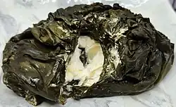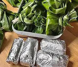 Another method involves stuffing fresh taro leaves with a meat filling that are tightly rolled (or made into balls) then stewed in pot in a manner similar to dolma or stuffed cabbage. These balls are sometimes referred to as rourou balls or wacipoki.[25][26] When these balls are made into parcels, they are often called palusami, influenced by nearby Samoa. Another wacipoki technique is forming them into patties with a mixture of chopped parboiled taro leaves, onions, and seasonings that are pan-fried, and simmered in a coconut milk sauce.[27][28] Because of the rising prices of taro (and food in general), instant noodles is sometimes mixed into the wacipoki as a filler.[29]