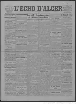 L'Echo d'Alger (French: The Echo of Algiers) was a daily newspaper in Algiers, Algeria, which was published between 1912 and 1961. Its subtitle was journal républicain du matin (French: Republican morning paper).[1] It was first a leftist publication, but from 1941 it supported the French rule in Algeria.