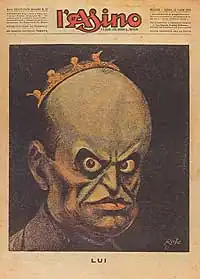 The publication opposed Mussolini's Fascist dictatorship and was forced to suspend publication in the spring of 1925 due to a new law restricting press freedom and after a long series of threats, harassment and interventions of fascist gangs in the newsroom.[2][3] For the cover of the final issue of L'Asino, Galantara made a caricature of Mussolini, entitled Lui (Him) that would become a role model of foreign designers worldwide. Mussolini appeared with a huge bald head and surmounted by a crown on which is written "trouble to anyone who touches me", a huge mouth and two big eyes wide and crossed by a light of madness.[7]