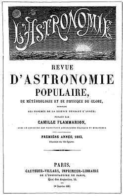 The magazine was established by Camille Flammarion and the first issue, dated 1882, was published on January 1, 1883. After SAF was founded in 1887, a second journal was created, called the Bulletin mensuel de la Société Astronomique de France. The two publications existed in parallel up to 1894. In the December 1894 issue, Flammarion announced in an editorial that L'Astronomie would cease to exist.[1] From January 1895 to December 1910, only the Bulletin de la Société Astronomique de France was published. Starting from 1912, the Bulletin was renamed L'Astronomie, while preserving the volume numbering of the Bulletin.