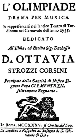 L'Olimpiade is an opera in the form of a dramma per musica in three acts by the Italian composer Giovanni Battista Pergolesi. Pergolesi took the text, with a few modifications, from the libretto of the same name by Pietro Metastasio. The opera first appeared during the Carnival season of 1735 at the Teatro Tordinona in Rome and "came to be probably the most admired"[1] of the more than 50 musical settings of Metastasio’s drama.[2]