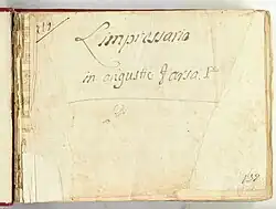 L'impresario in angustie is an operatic farsa in one act by composer Domenico Cimarosa with an Italian libretto by Giuseppe Maria Diodati. The opera premiered at the Teatro Nuovo in Naples, Italy in 1786.[1]