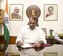 On 7 July 2021, Murugan was sworn in as the Minister of State in the Ministry of Fisheries, Animal Husbandry and Dairying and Ministry of Information and Broadcasting during the Cabinet reshuffle.[28] Murugan is the first from the Arunthathiyar community to be made a Union minister since Independence.[29] He had 21 criminal cases against him in August 2021, the most of any minister in the Modi's cabinet.[30] Murugan claimed there were "vested interests" behind the 2020–2021 Indian farmers' protest in northern states in October 2021.[31]