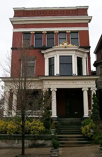 The Good Mansion is a three-story Classical Revival style brick townhouse. It features a full-width porch with pairs and clusters of fluted wooden columns on sandstone plinths. The third story facade has an engaged Ionic order brick colonnade. It has a sumptuous interior.[3]