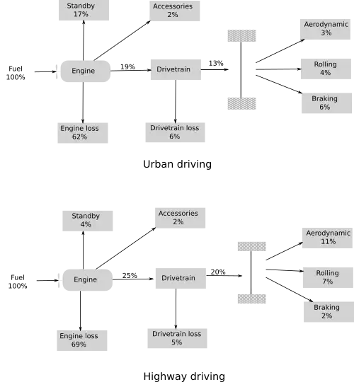 Ideally, a car traveling at a constant velocity on level ground in a vacuum with frictionless wheels could travel at any speed without consuming any energy beyond what is needed to get the car up to speed. Less ideally, any vehicle must expend energy on overcoming road load forces, which consist of aerodynamic drag, tire rolling resistance, and inertial energy that is lost when the vehicle is decelerated by friction brakes. With ideal regenerative braking, the inertial energy could be completely recovered, the only options for reducing aerodynamic drag or rolling resistance other than optimizing the vehicle's shape and the tire design. Road load energy or the energy demanded at the wheels, can be calculated by evaluating the vehicle equation of motion over a specific driving cycle.[31] The vehicle powertrain must then provide this minimum energy to move the vehicle and will lose a large amount of additional energy in the process of converting fuel energy into work and transmitting it to the wheels. Overall, the sources of energy loss in moving a vehicle may be summarized as follows: