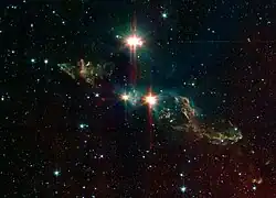 ![]() HH 154 in mid-infrared around L1551 IRS 5 (bright red star in the middle) and L1551 NE (less bright red star to the left) Credit: NASA Spitzer Space Telescope | |