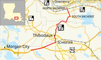 From the south, LA 20 begins at LA 182 in the northwest Terrebonne Parish town of Gibson. The road parallels then intersects U.S. 90 (Future I-49) at two locations (Exits 189 & 194) as it heads northeastward, where it intersects LA 24 in Schriever. LA 20 turns due north and intersects LA 1 in Thibodaux as it continues northward. The road then passes through Chackbay before it enters St. James Parish. LA 20 runs northward through South Vacherie and ends at an intersection with LA 18 in North Vacherie.